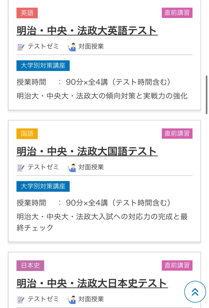 こちらも言わずと知れた大手。かつては「テキストの河合」と呼ばれていました。また初期は文系の指導に力を入れていたことで現在も文系の生徒が多く在籍しています。その証拠に明治大学の合格者数は8741人と圧倒的な数を誇ります。駿台に対して授業時間は90分と長いですが演習の時間も取られていて、演習解説が授業内で完結し定着率が高いことがその魅力です。また大手にもかかわらず校舎が多いことも魅力です。講師に直接指導、質問しにくいという大手塾のデメリットをある程度カバーできています。明治大学単体の直前講習はありませんでしたが、MARCHの英語などの講座は設置されていて明治の過去問を扱い、解き方や考え方を教えてくれるそうです。(あの明治が単体でないだとっ!みんな頑張ろう)