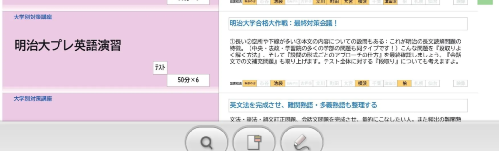 続いては東進です。東進は何と言っても校舎が多いです!(駅を降りると林先生とサングラスの物理教師がこちらを睨み付けてきます)明治大学の合格者数は現役だけで4853人です。私大対策過去問演習講座は明治学部別の過去問解説や実戦での解き方を教えてくれます。ここまで過去問をしっかり解説してくれる予備校は東進だけです!直前対策講座はどの予備校と比べても東進が圧倒的でしょう(筆者も過去問データベースにはお世話になりました。)有名講師の授業が通年でとることができ、部活でスタートが遅れた人や基礎からやり直したい人にもお勧めです。これが現役生で合格者を多数出している秘訣かもしれません!
