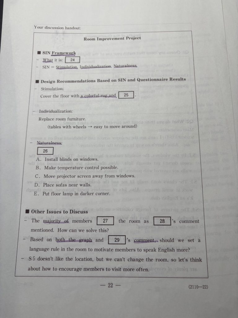 今回は問題番号25の前のandに下線を引いていますがこれは本文のIn addition,に対応していて、色の話題から障害の話題へと転換しています。したがって④の障害物についての選択肢が正解だと、構造から導き出せます。このようにうまくメモを使うことが本番は求められます。
