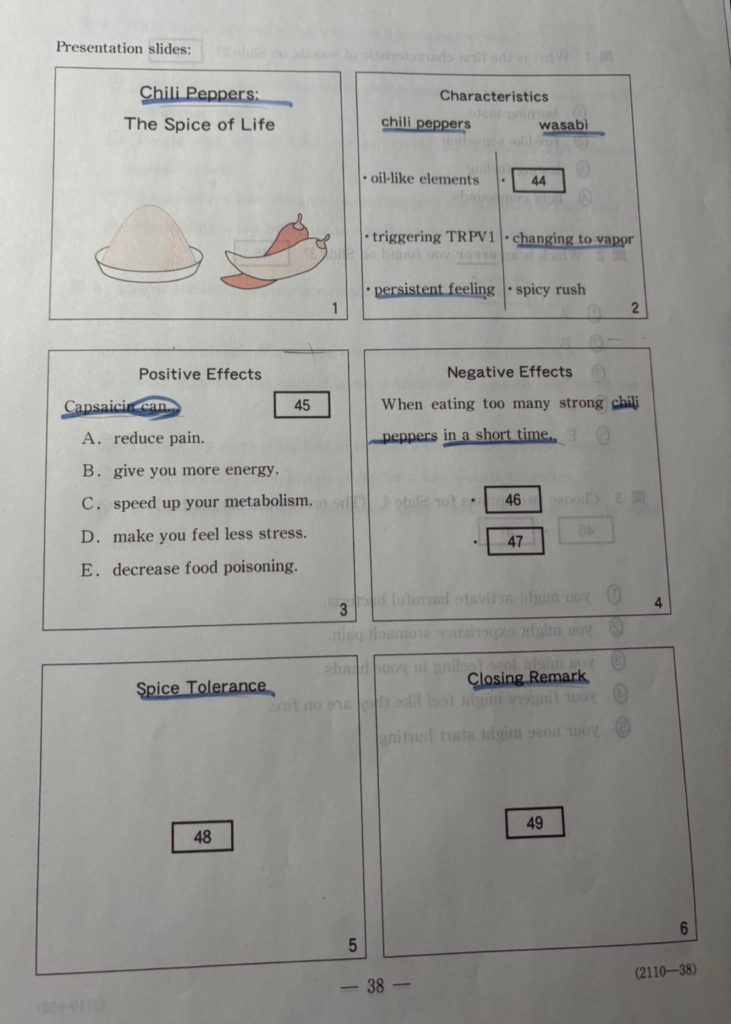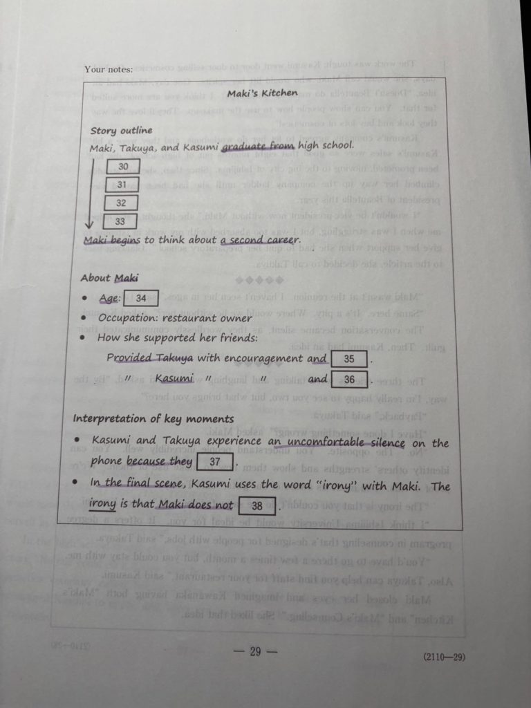 第4問からはメモが提示されその穴埋めが基本となります。この時、メモは並び替え問題と同じ感覚で読みましょう。つまり先読みです!今はメモのこの部分に該当するな、次は多分この話題だな、と予測しながら本文も読みましょう。最後に本文を見れば答えがわかるということです。